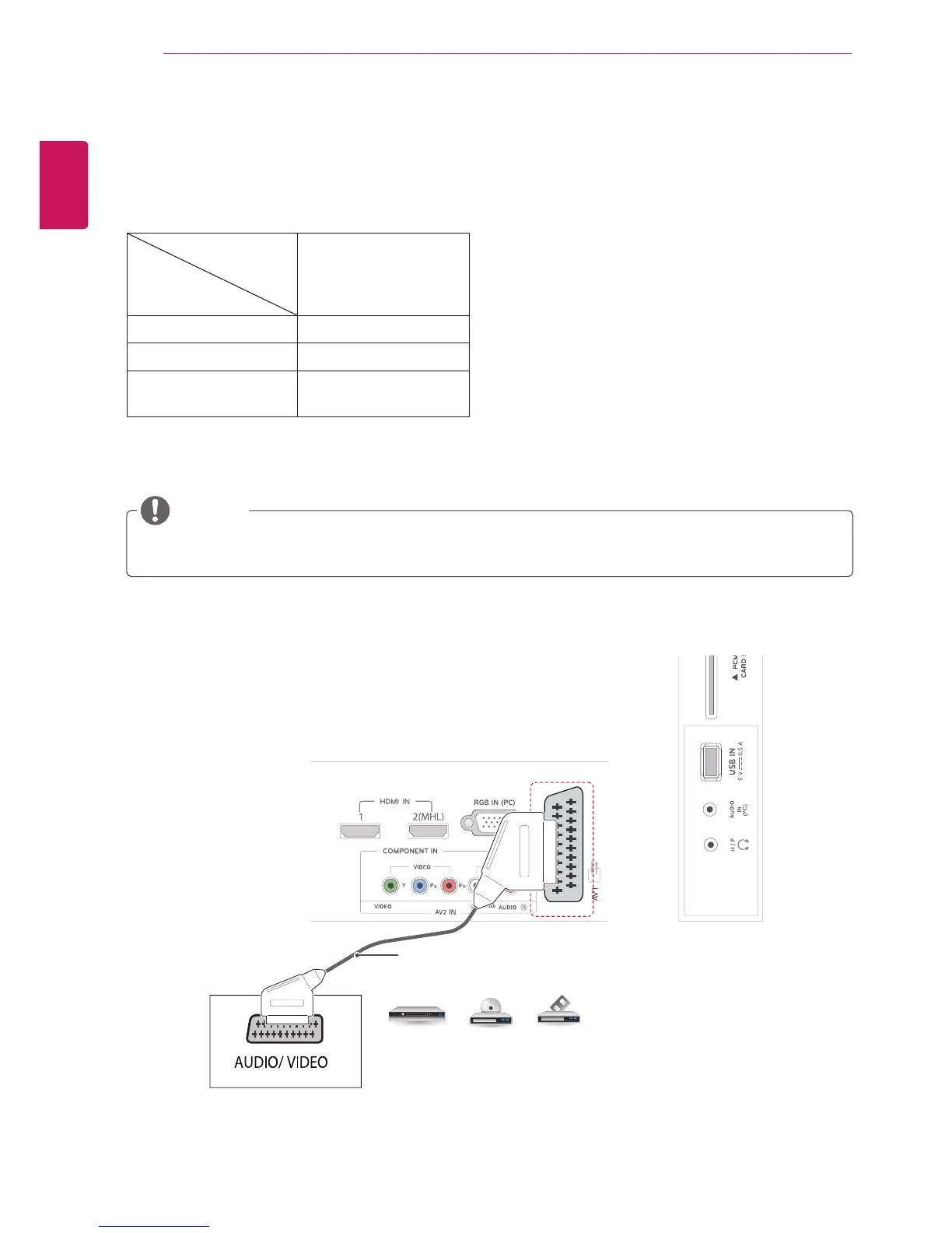 Transmits the video and audio signals from an external device to the TV. Connect the external device