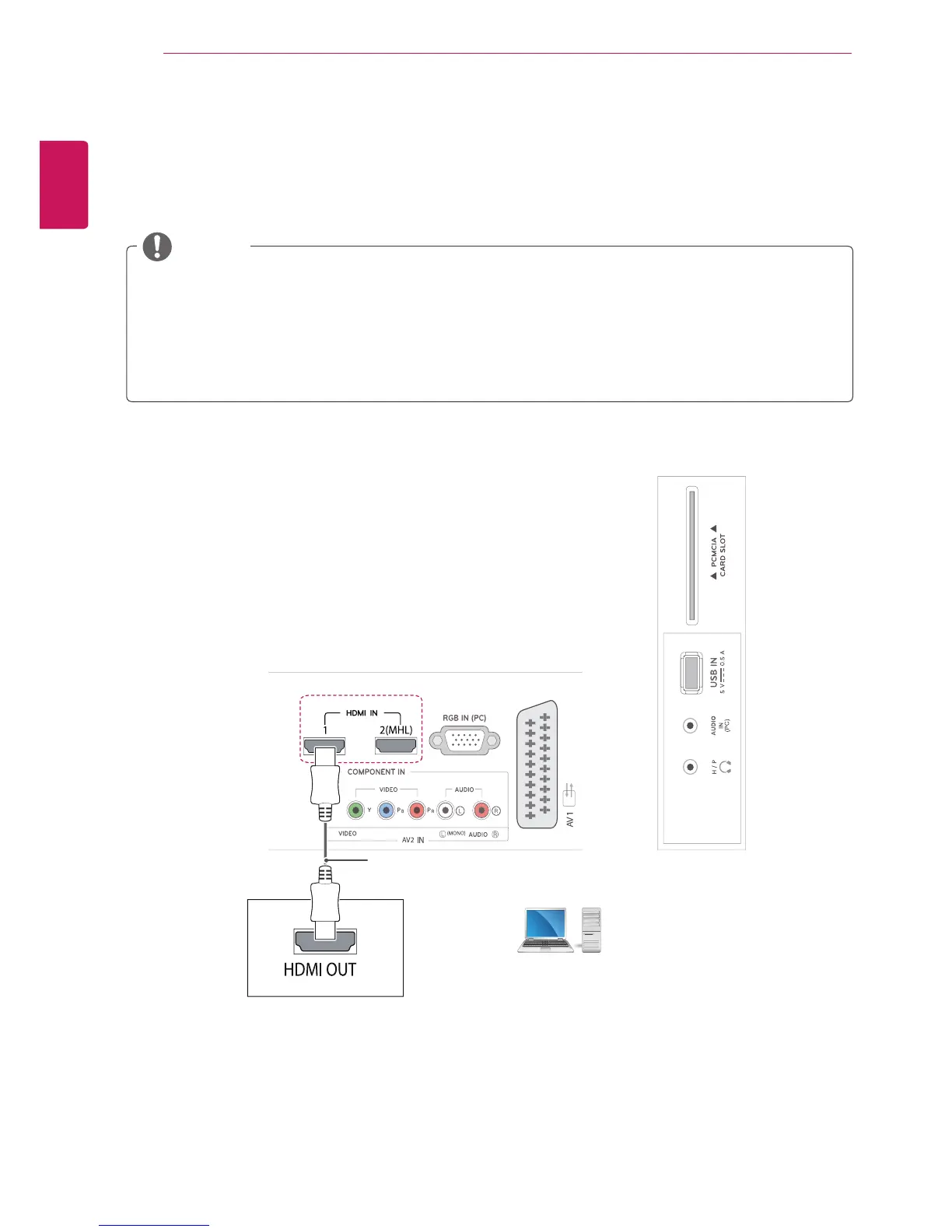 HDMI cable as shown in the following illustrations. You should set PC as an input label to connect the PC to