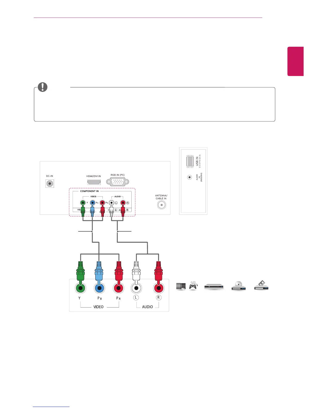 Transmits the analog video and audio signals from an external device to the TV. Connect the external device