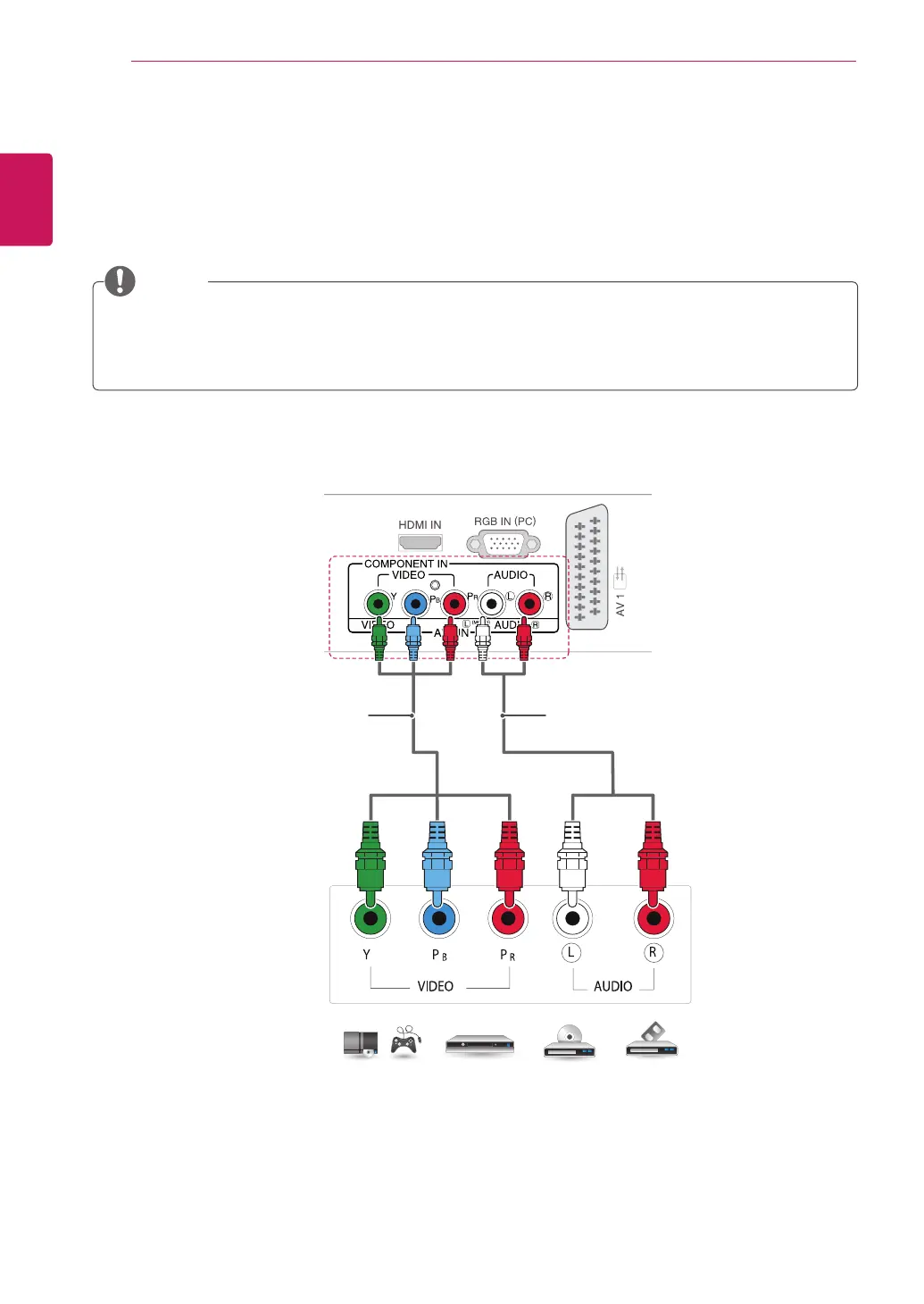 device and the TV with the component cable as shown on the following illustration. To display images by