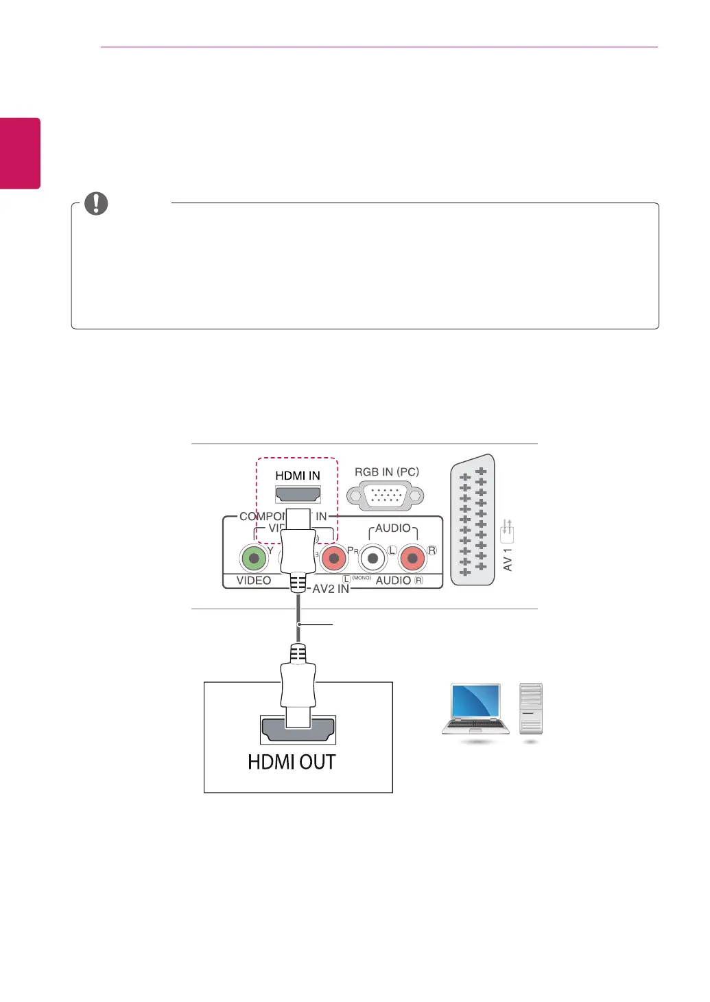 HDMI cable as shown in the following illustrations. You should set PC as an input label to connect the PC to