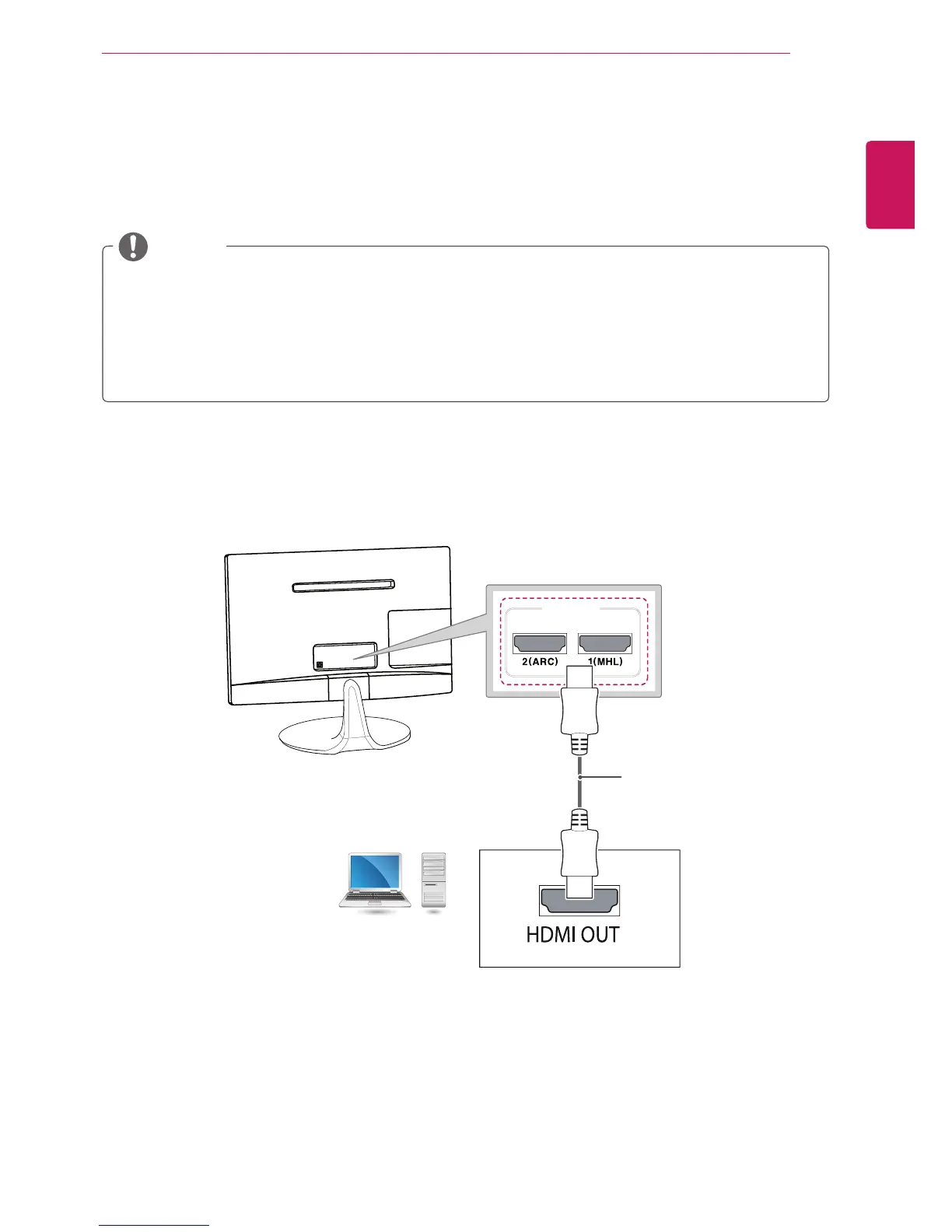 HDMI cable as shown in the following illustrations. You should set PC as an input label to connect the PC to