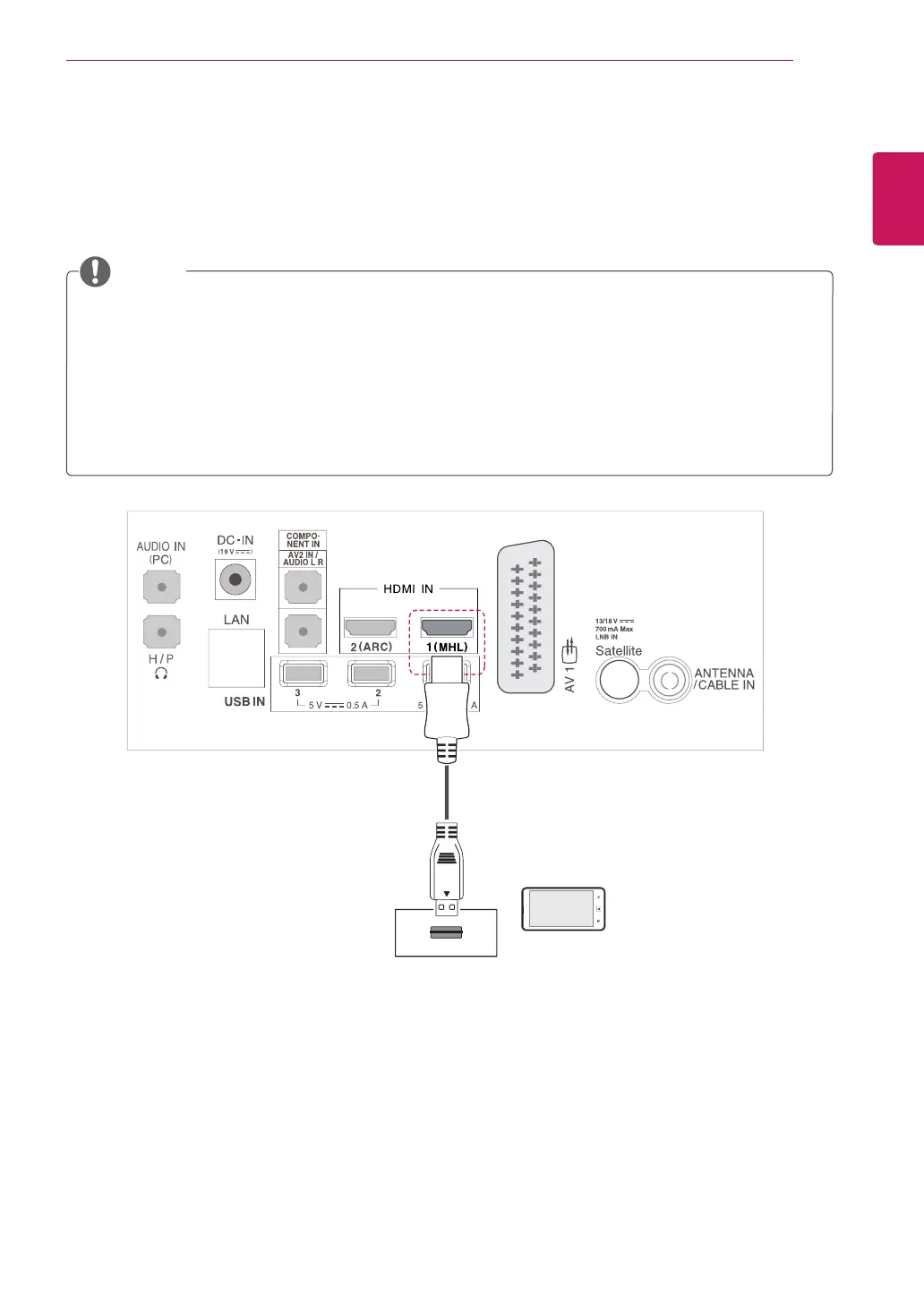 Connect the mobile phone to the HDMI IN 1(MHL) port to view the phone screen on the TV.