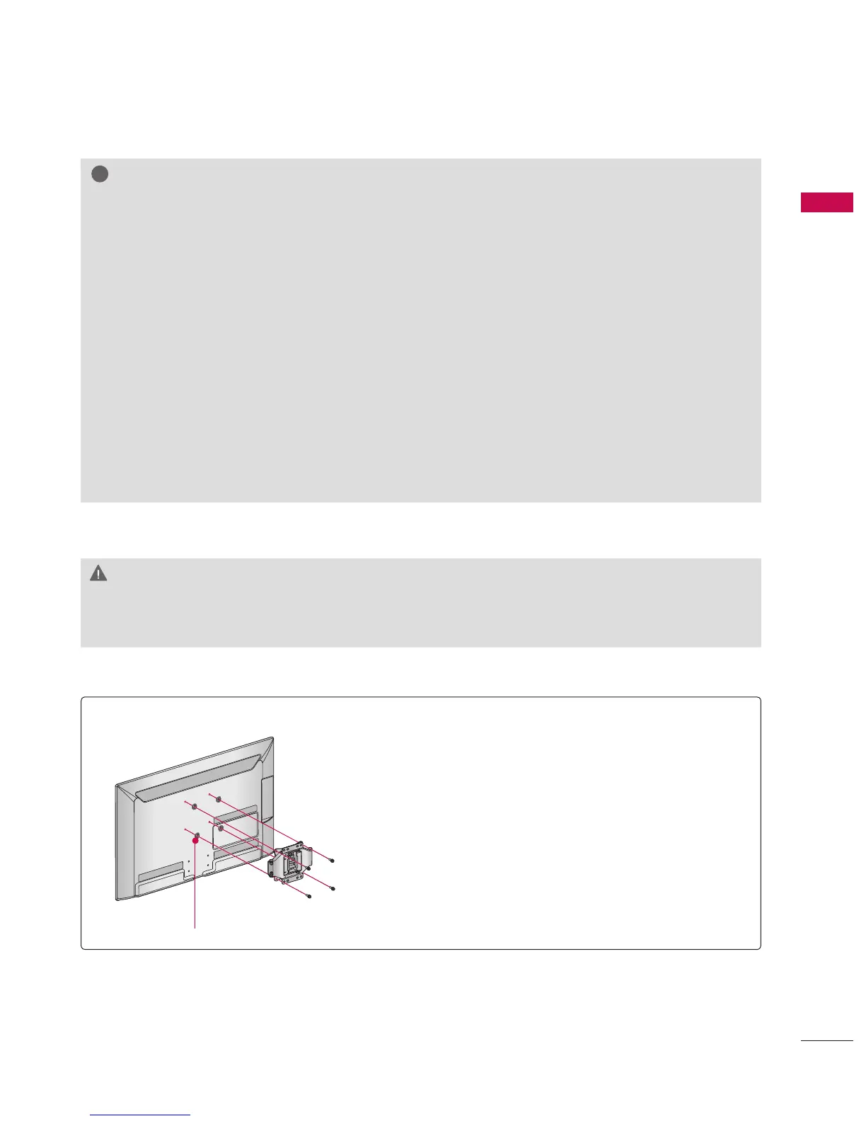 Ź Do not install your wall mount kit while your TV is turned on. It may result in personal injury due to