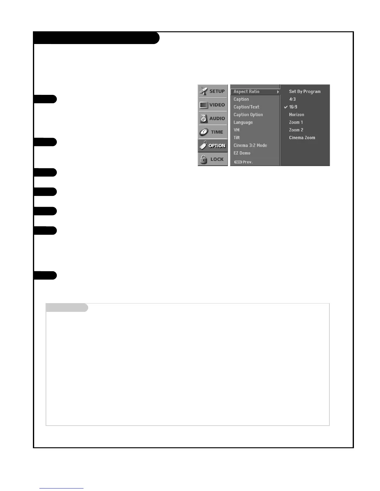 Set By Program Select the proper picture proportion to match the source’s image. (4:3 → 4:3, 16:9 → 16:9)