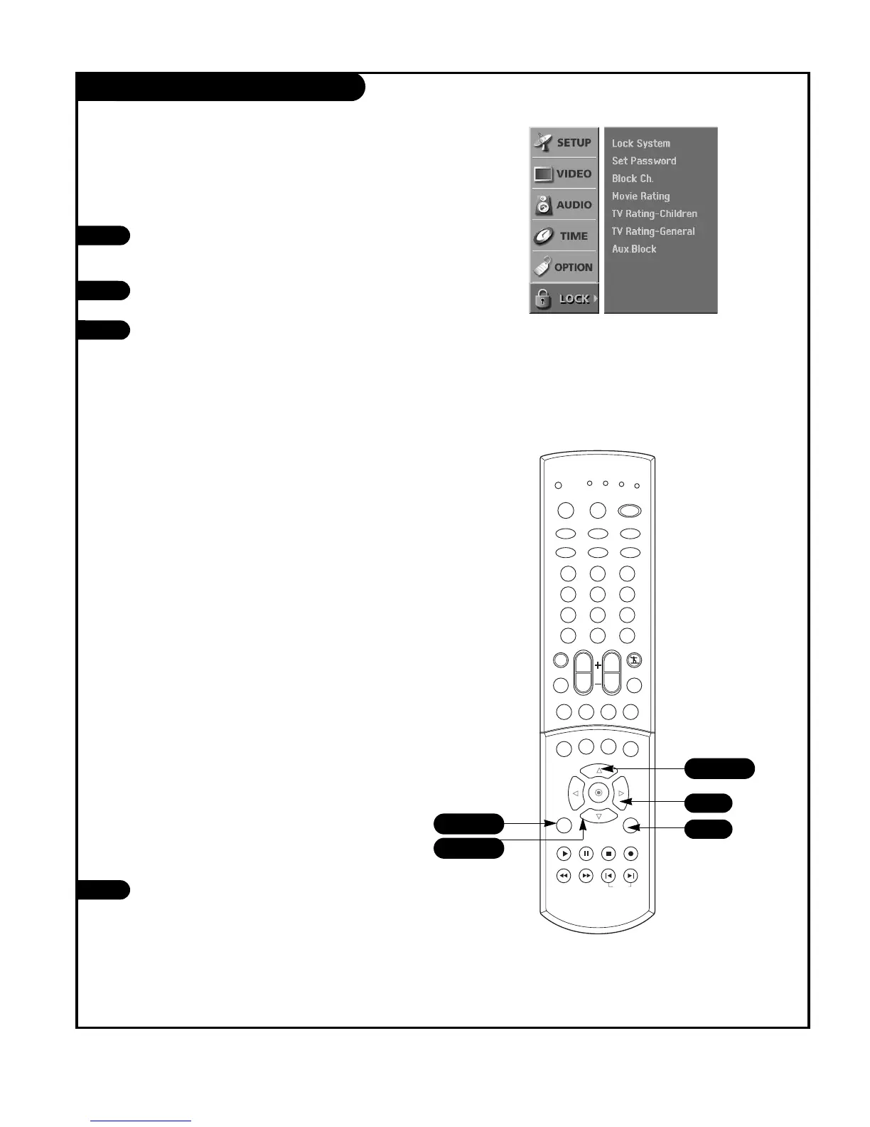 Lets you set up blocking schemes to block specific channels, ratings, and viewing