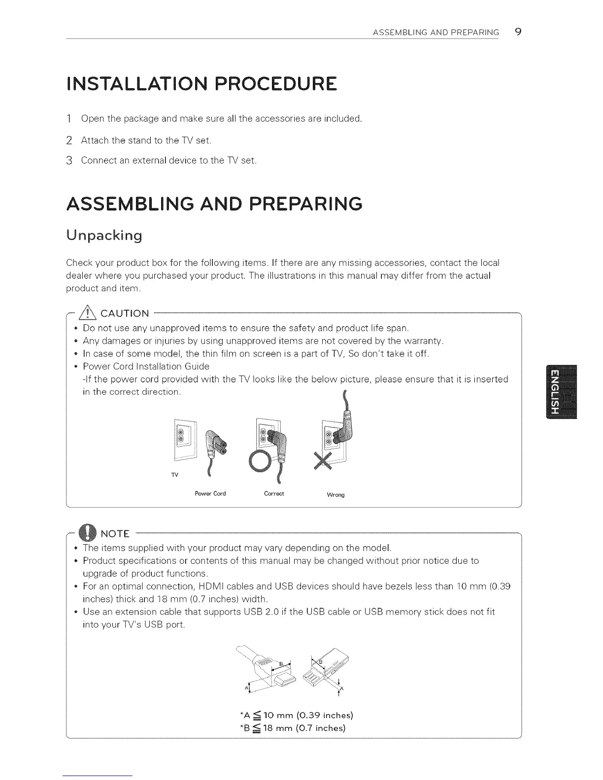• For an optimal connection, HDMI cables and USB devices should have bezels less than 10 mm (0.39