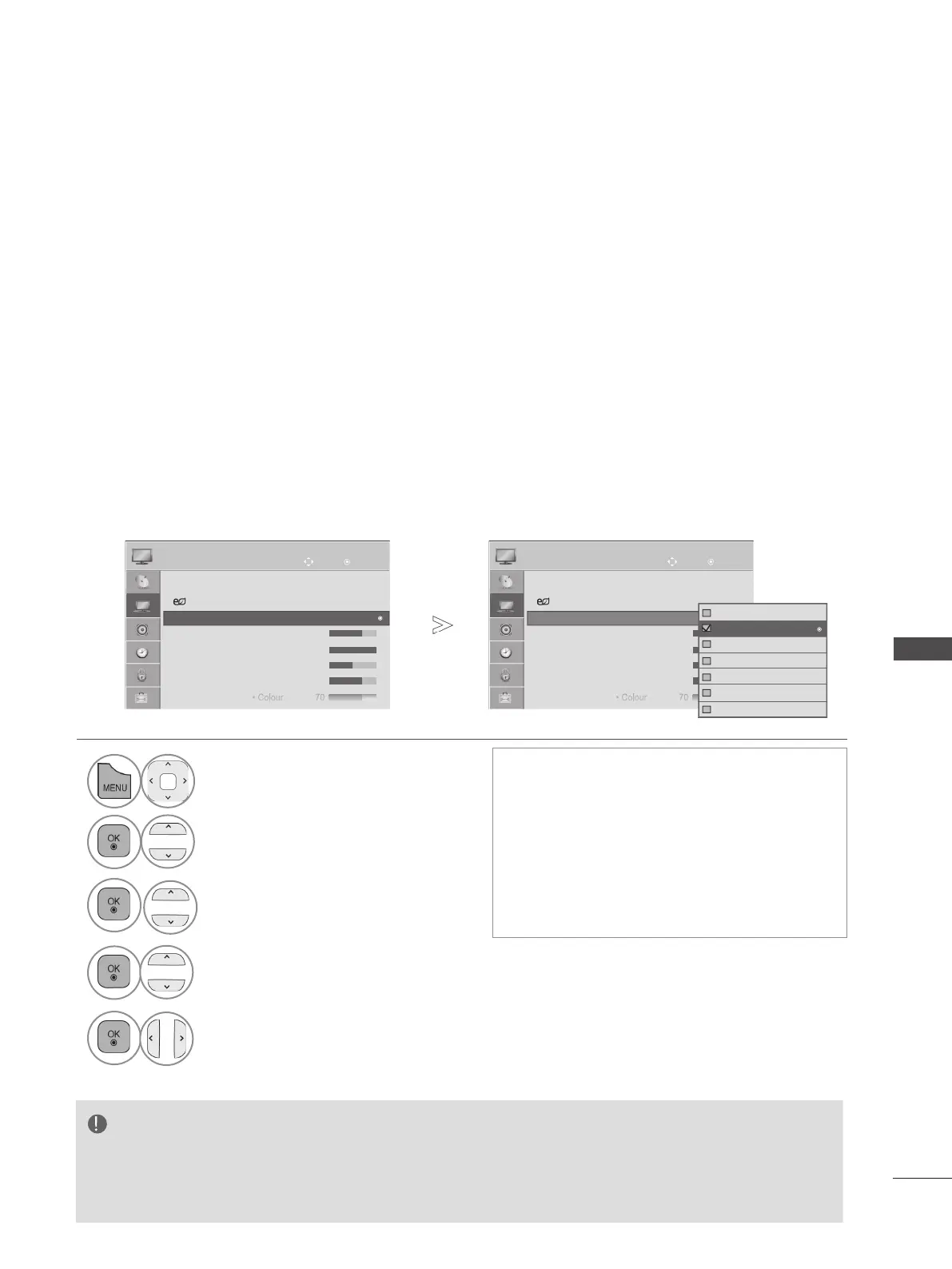 ► You cannot adjust colour, sharpness and tint in the RGB-PC/HDMI-PC mode.