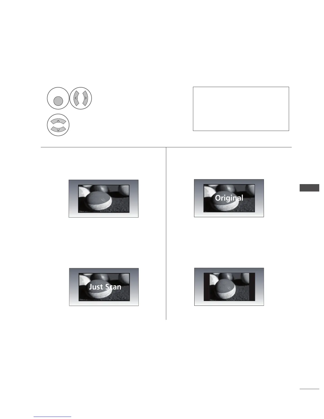 You can watch the screen in various picture formats; 16:9, Just Scan, Original, 4:3, 14:9, Zoom and Cinema Zoom.