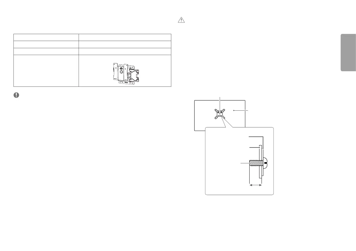 • Use the wall mounting bracket and screws that conform to VESA standards. Damage caused by the use or