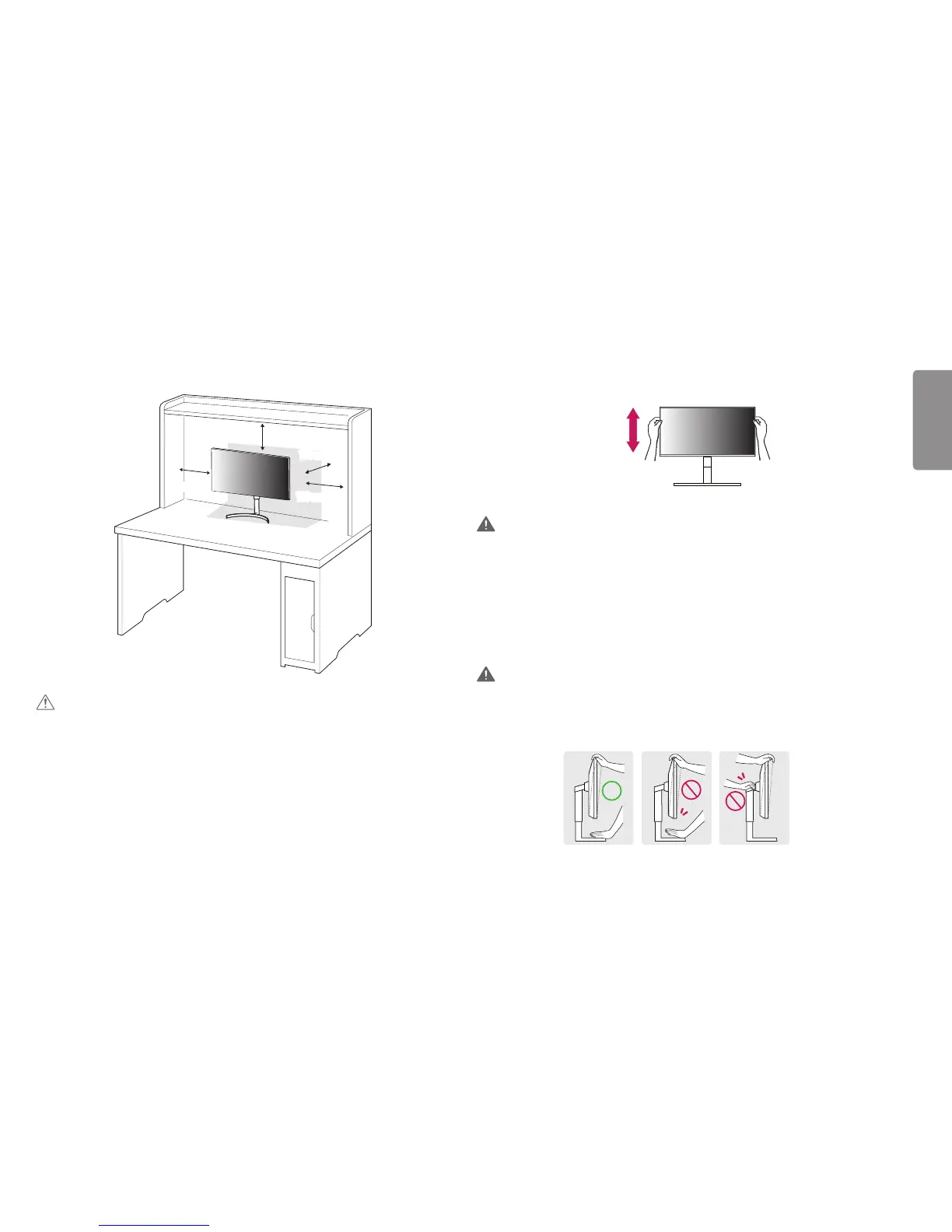 • To avoid injury to the fingers when adjusting the screen, do not hold the lower part of the monitor’s frame as