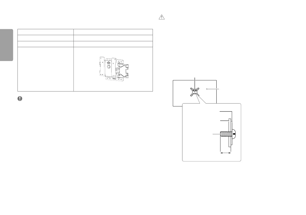 • Use the wall mounting bracket and screws that conform to VESA standards. Damage caused by the use or
