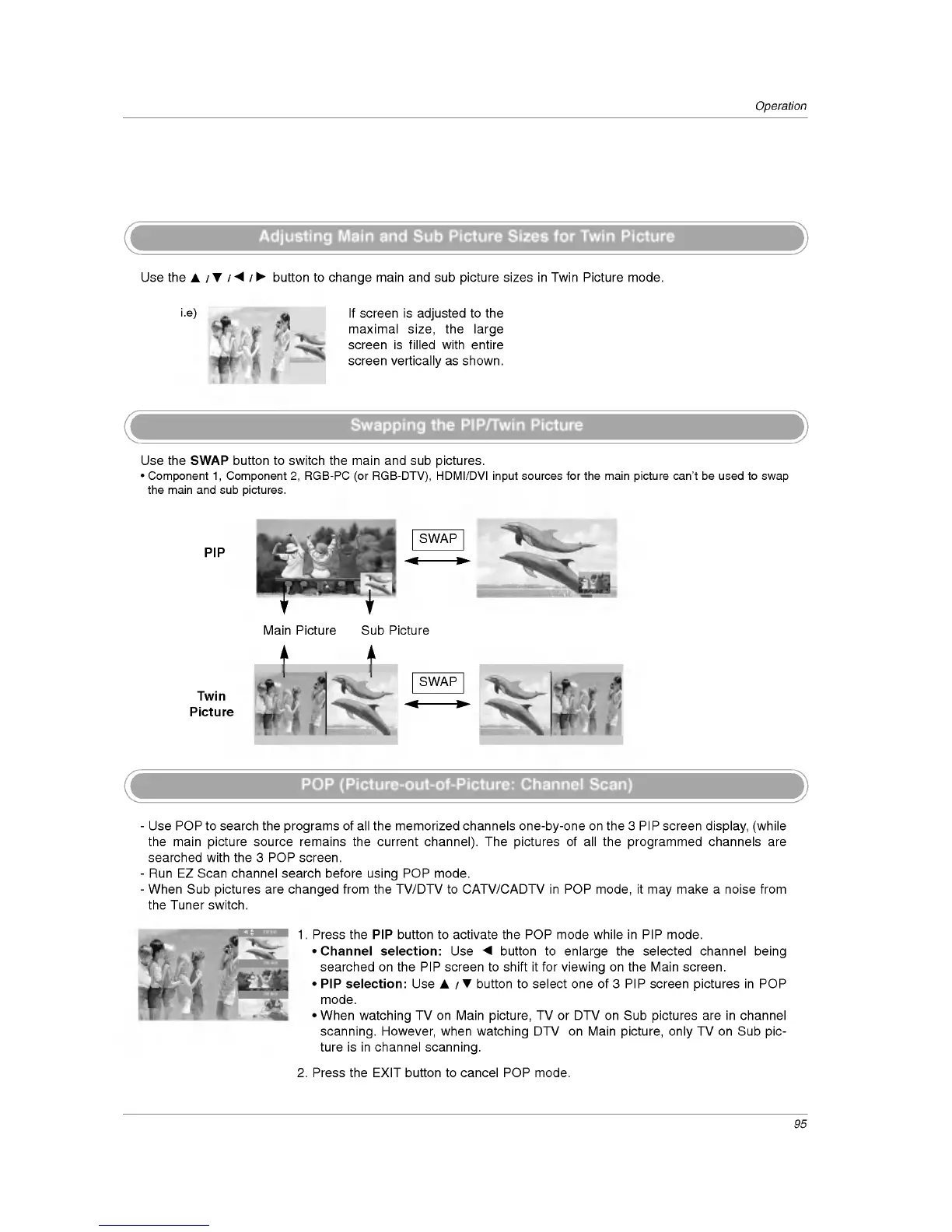 LG 37LP1D - Adjusting Main and Sub Picture Sizes for Twin Picture; Swapping the Pip;Twin Picture; POP (Picture-Out-Of-Picture: Channel Scan)