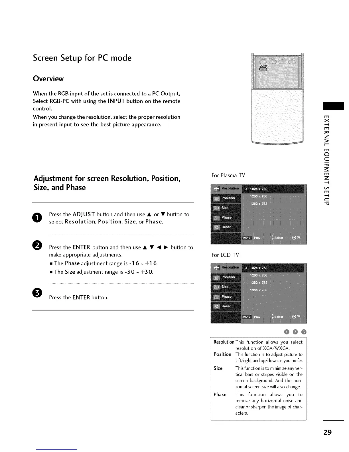 Adjustment for screen Resolution, Position,