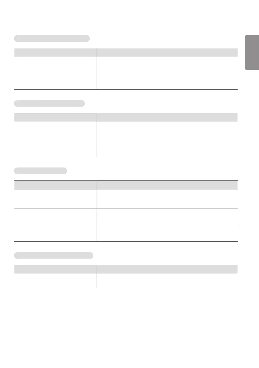 Screen color is unstable or mono-colored. • Check the connection status of the signal cable. Or, re-insert the PC