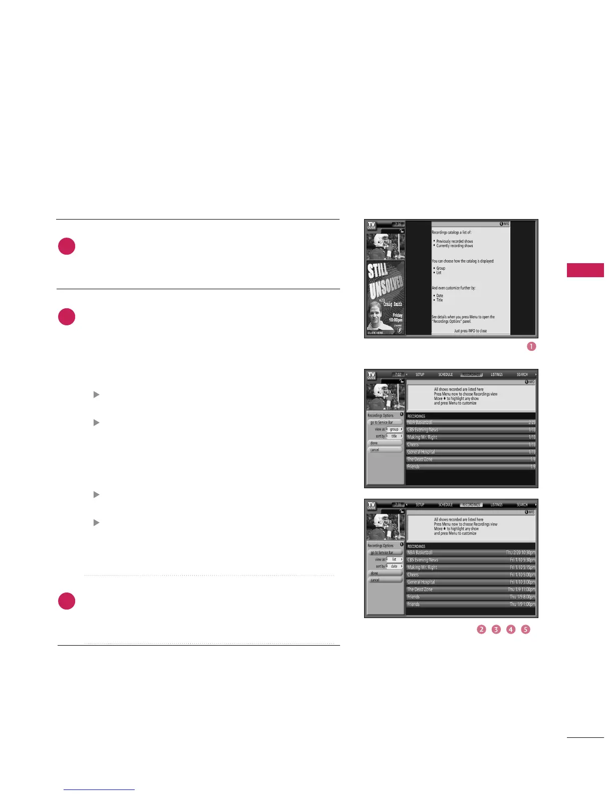 Recordings displays a list of previously recorded or currently recording shows on a