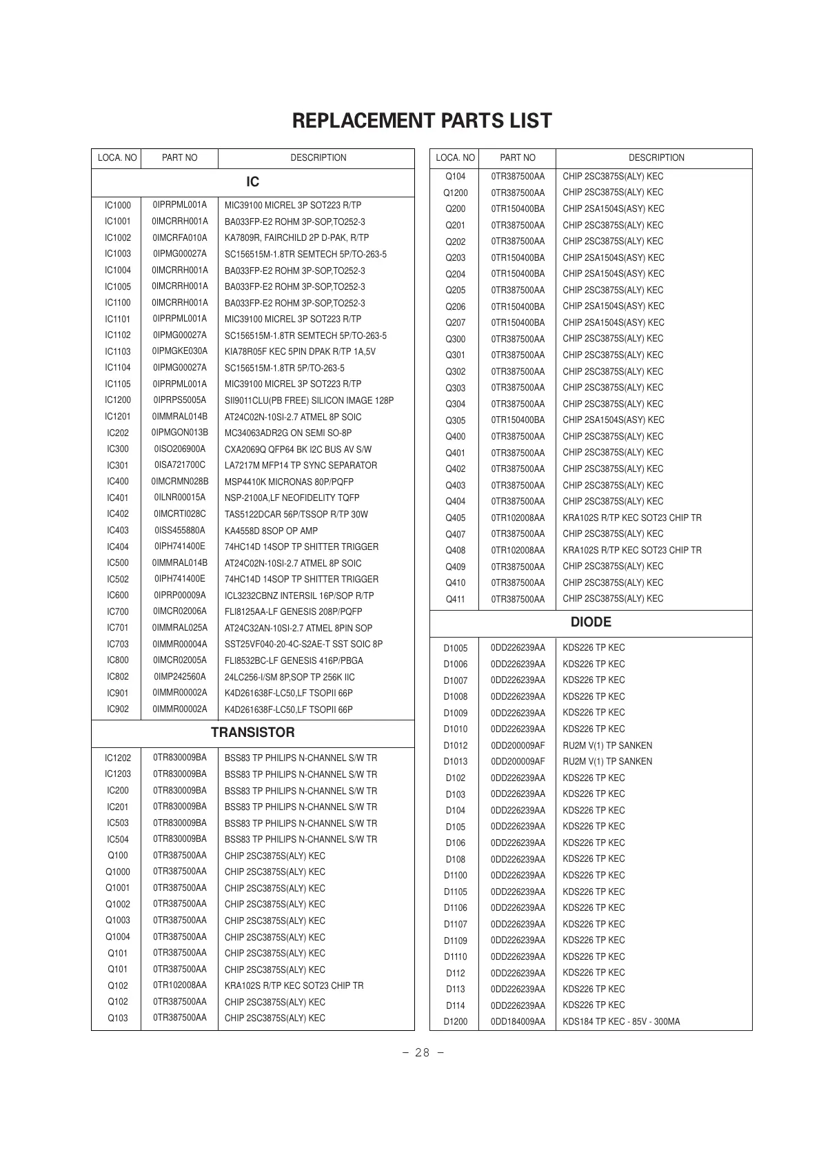 REPLACEMENT PARTS LIST