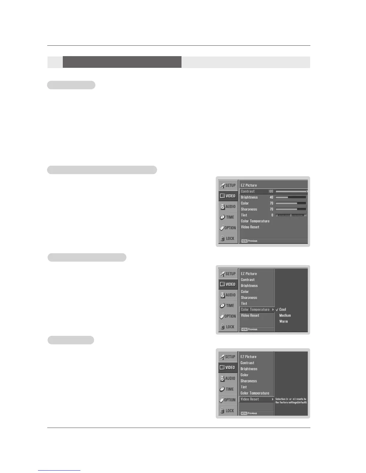 - When adjusting Video menu options (contrast, brightness, color, sharpness, tint, and color temperature) manually, EZ
