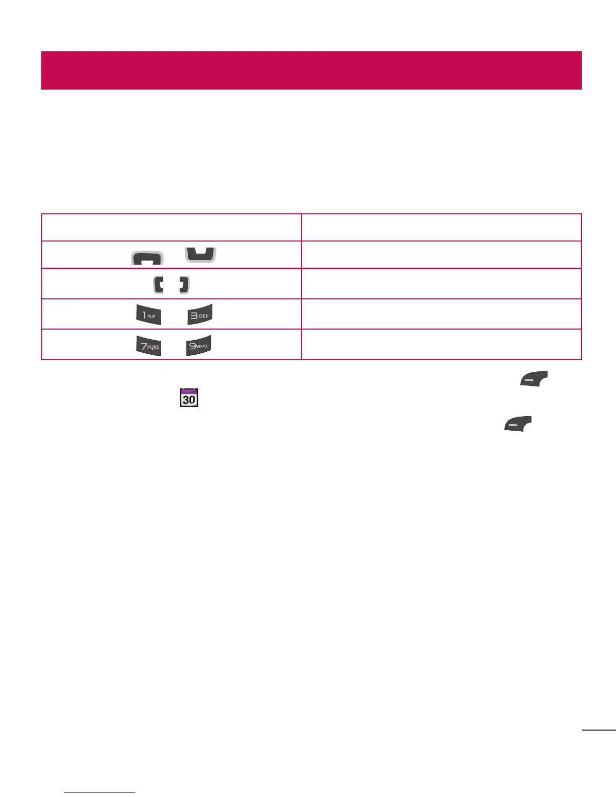 The chart below shows the keys that can be used to navigate the Calendar: