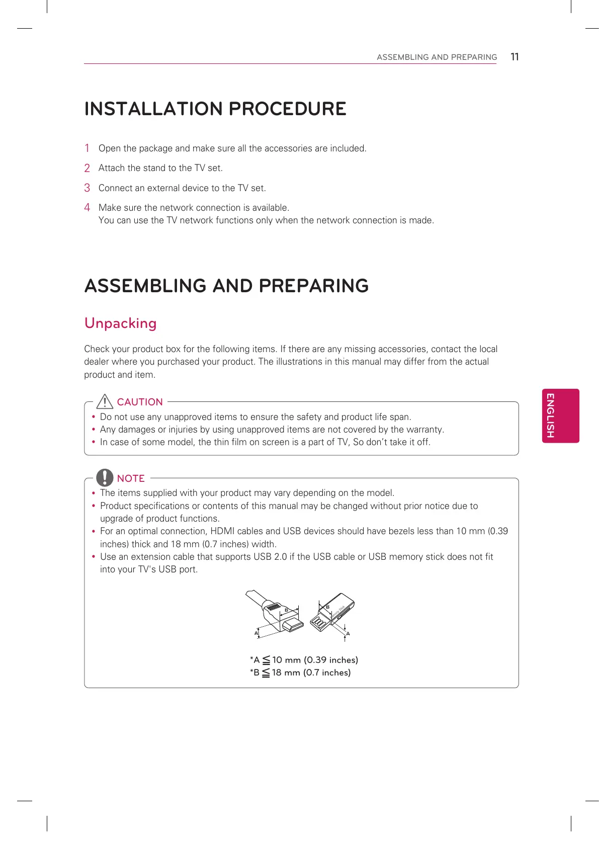 For an optimal connection, HDMI cables and USB devices should have bezels less than 10 mm (0.39