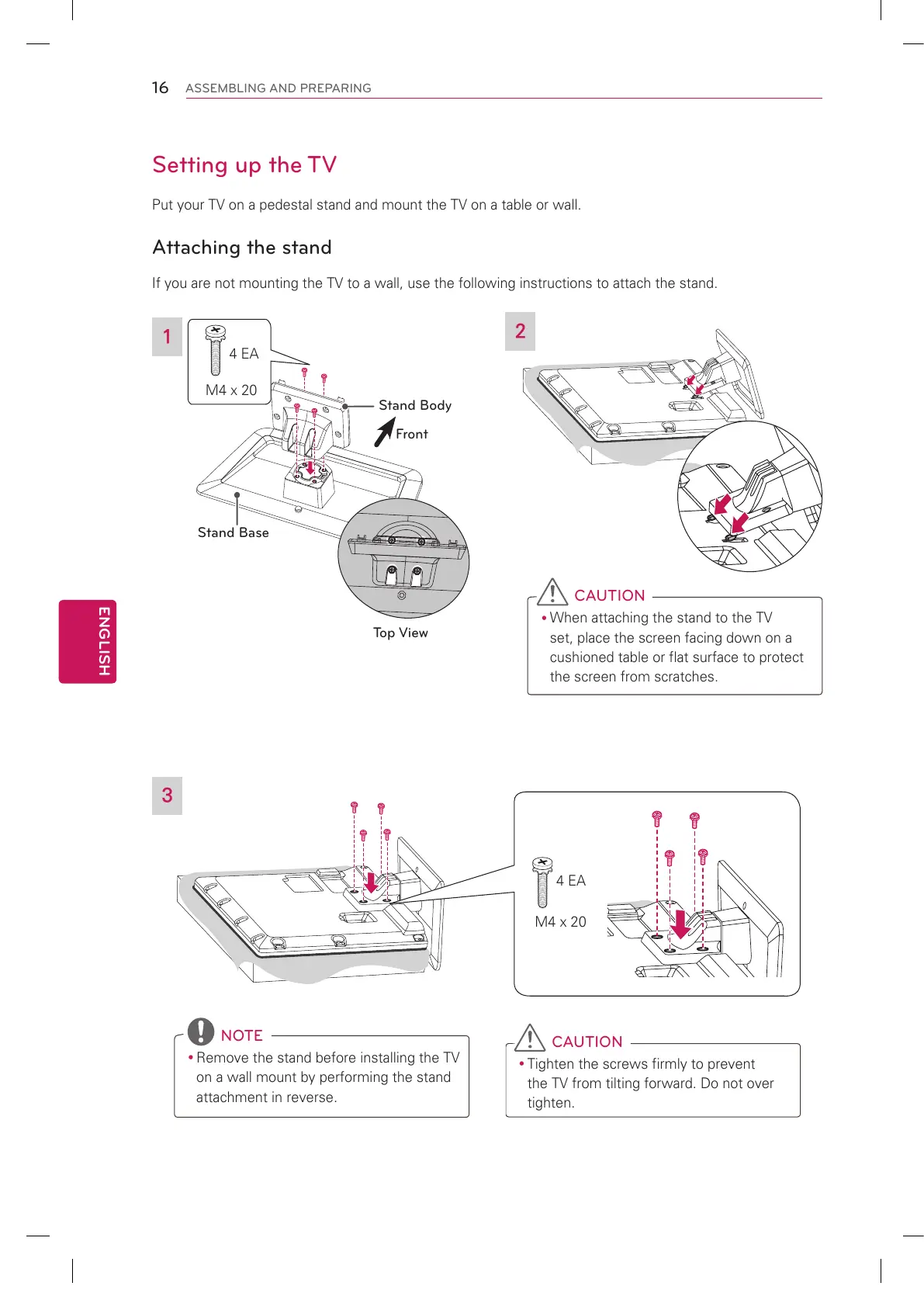 If you are not mounting the TV to a wall, use the following instructions to attach the stand.