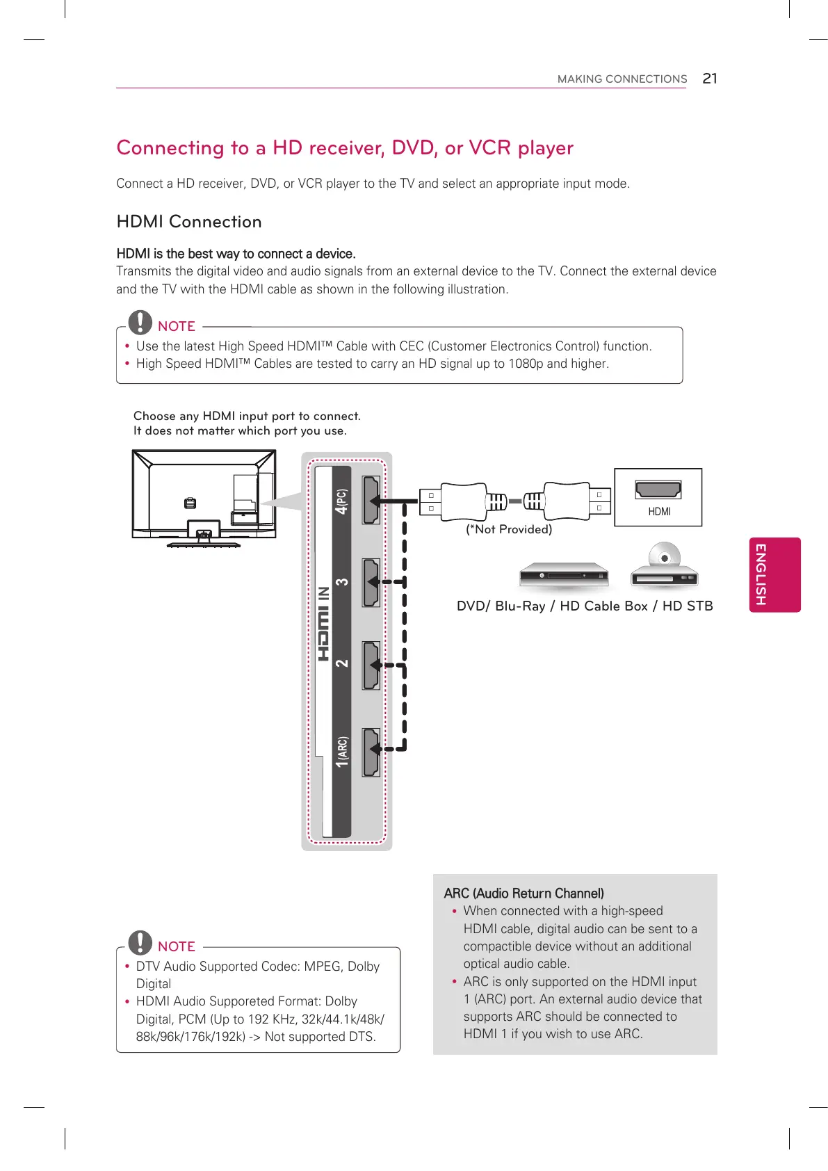 Transmits the digital video and audio signals from an external device to the TV. Connect the external device