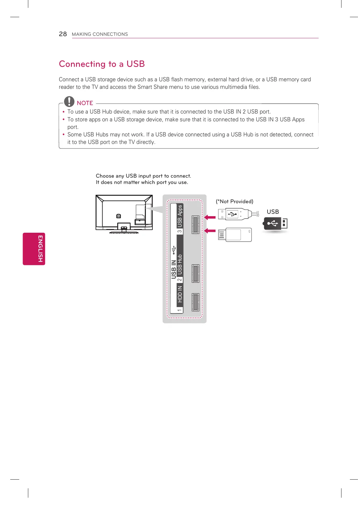 Some USB Hubs may not work. If a USB device connected using a USB Hub is not detected, connect