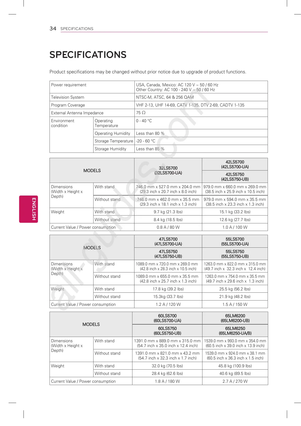 Weight With stand 32.0 kg (70.5 lbs) 45.8 kg (100.9 lbs)