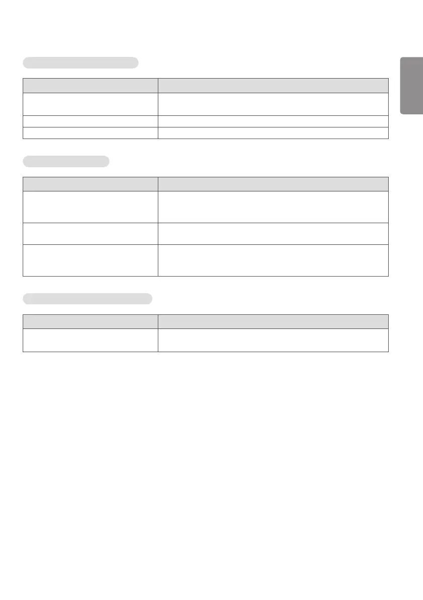 Screen color is unstable or mono-colored. • Check the connection status of the signal cable. Or, re-insert the PC
