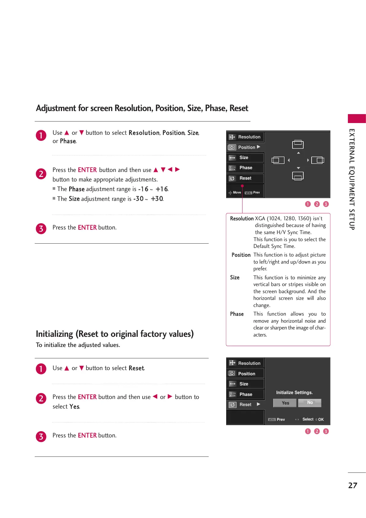 Adjustment for screen Resolution, Position, Size, Phase, Reset