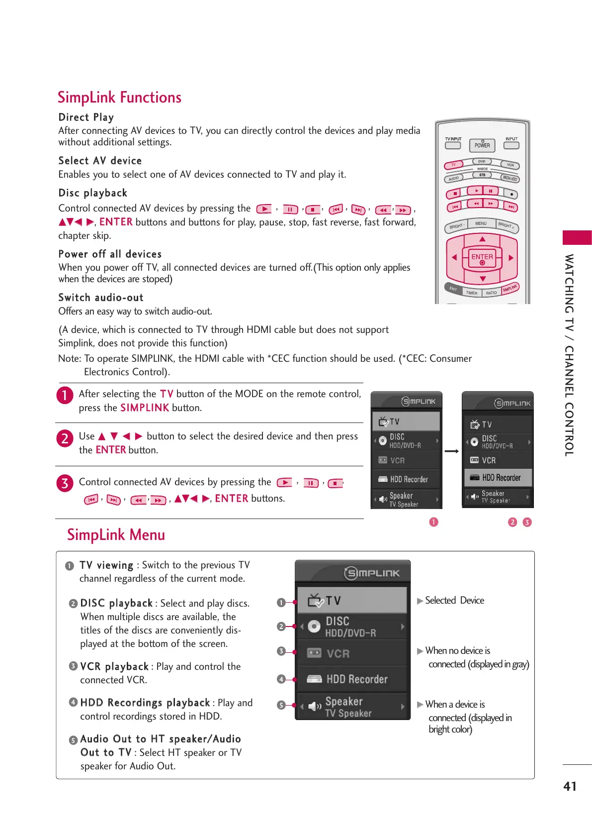 Note: To operate SIMPLINK, the HDMI cable with *CEC function should be used. (*CEC: Consumer