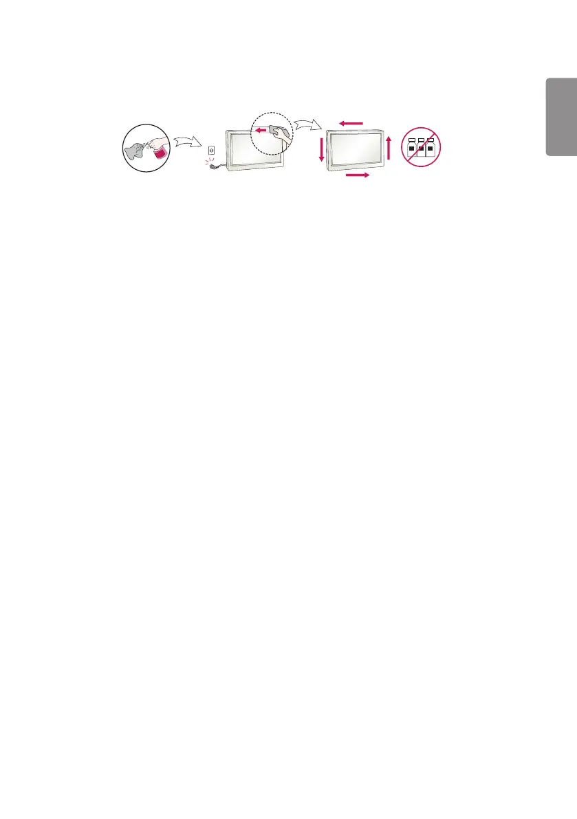 • Spray water onto a soft cloth 2 to 4 times, and use it to clean the front frame; wipe in one direction only. Too much