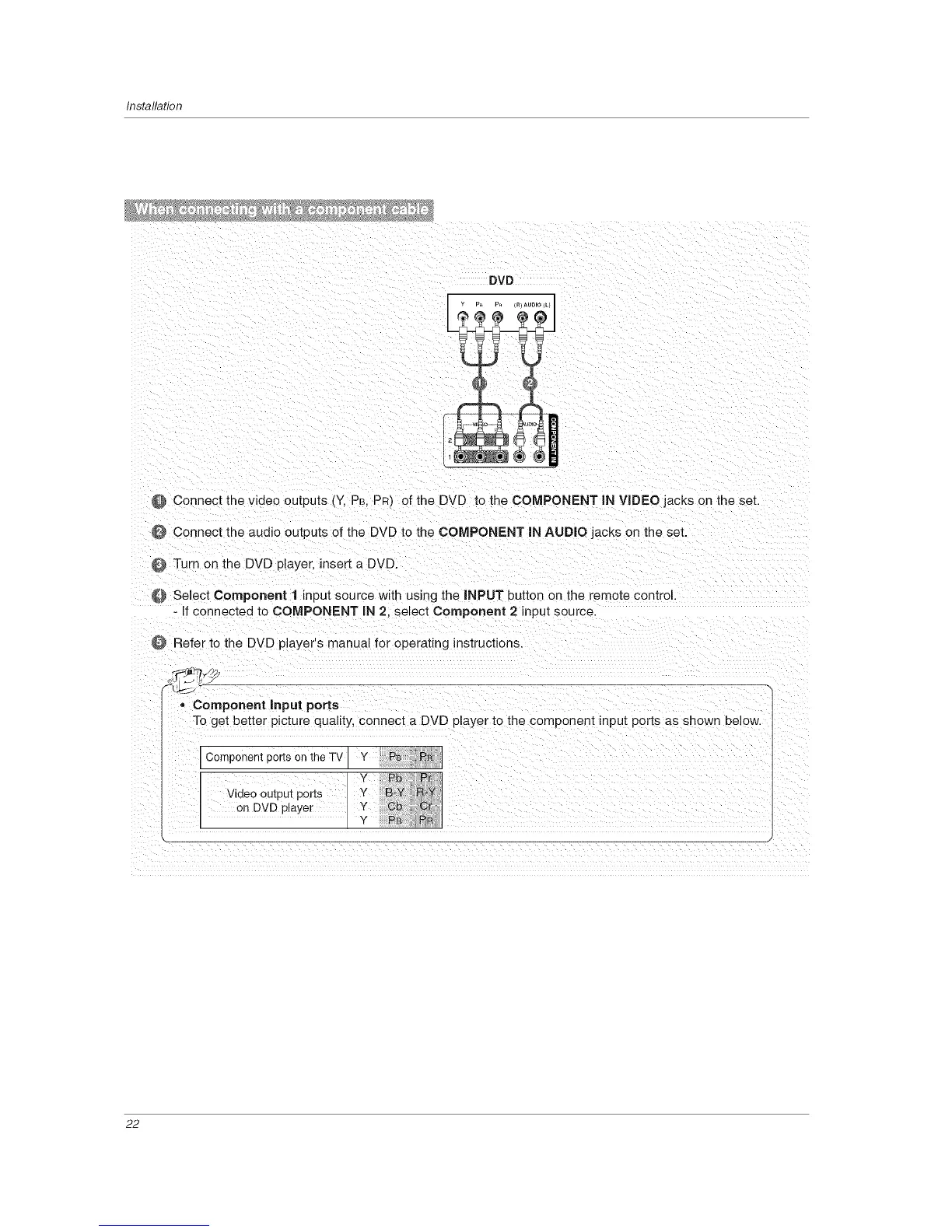 @ Connect the video outputs (Y. PB. PR'} of the DVD to the COMPONENT IN VIDEO jacks on the set.