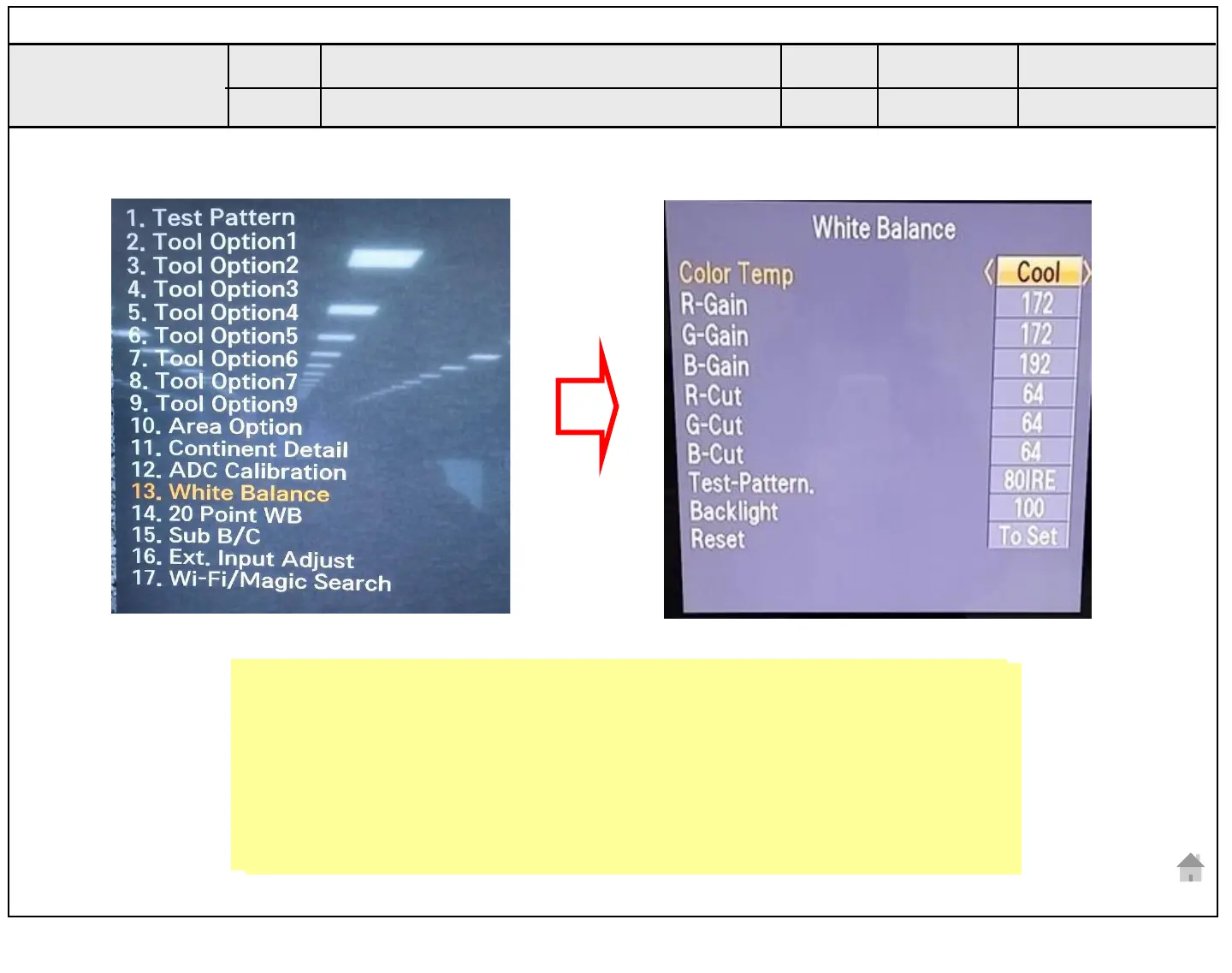 3. After recording the R, G, B (GAIN, Cut) value of Color Temp