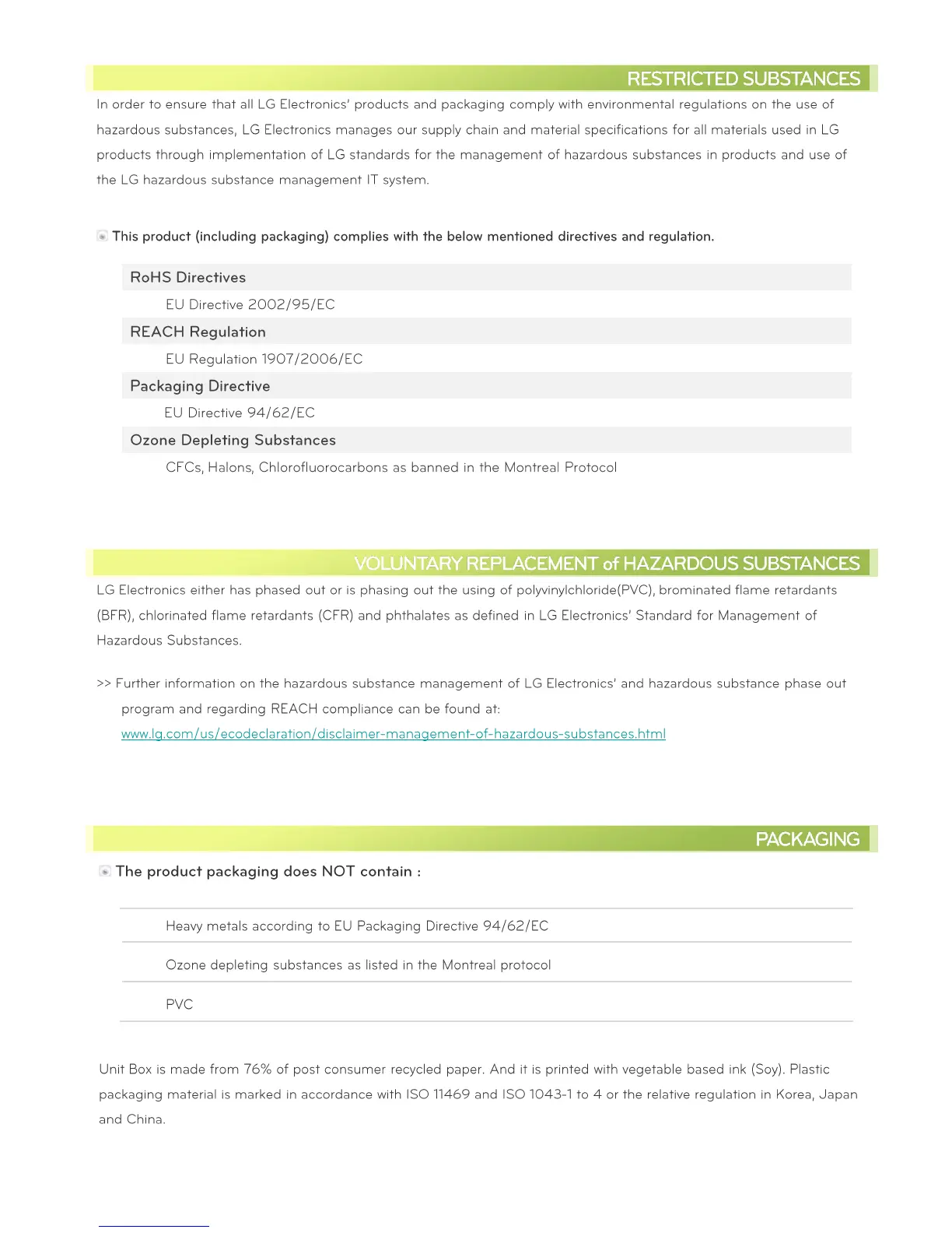 LG 620 - Substance Compliance and Packaging; Restricted Substances Compliance; Voluntary Hazardous Substance Replacement; Packaging Material Information