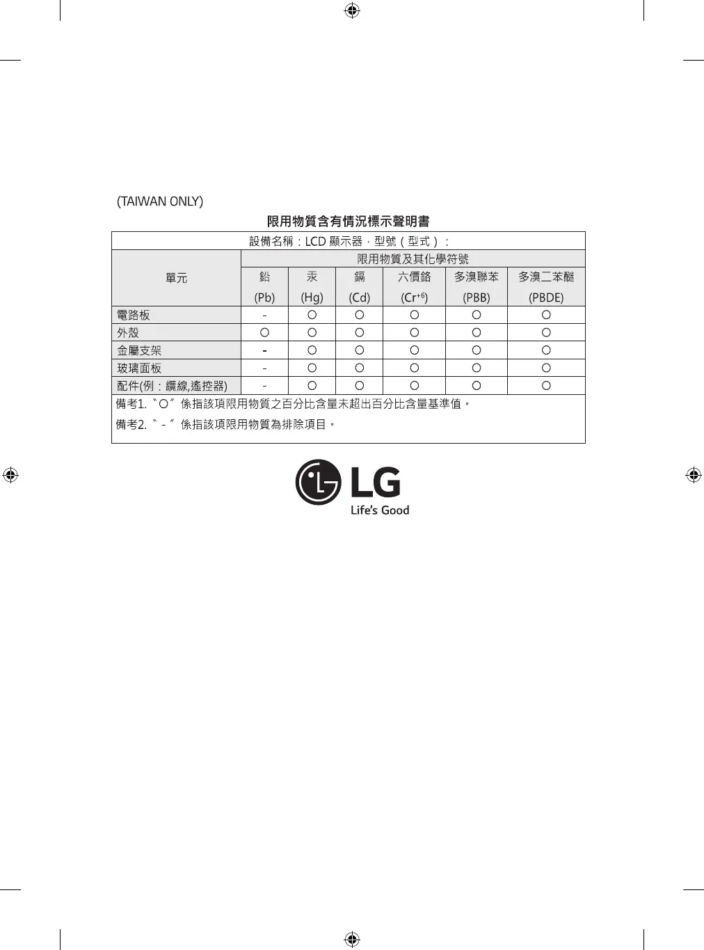 LG 98UH5F - Hazardous Substances Declaration (Taiwan); Substance Content Information