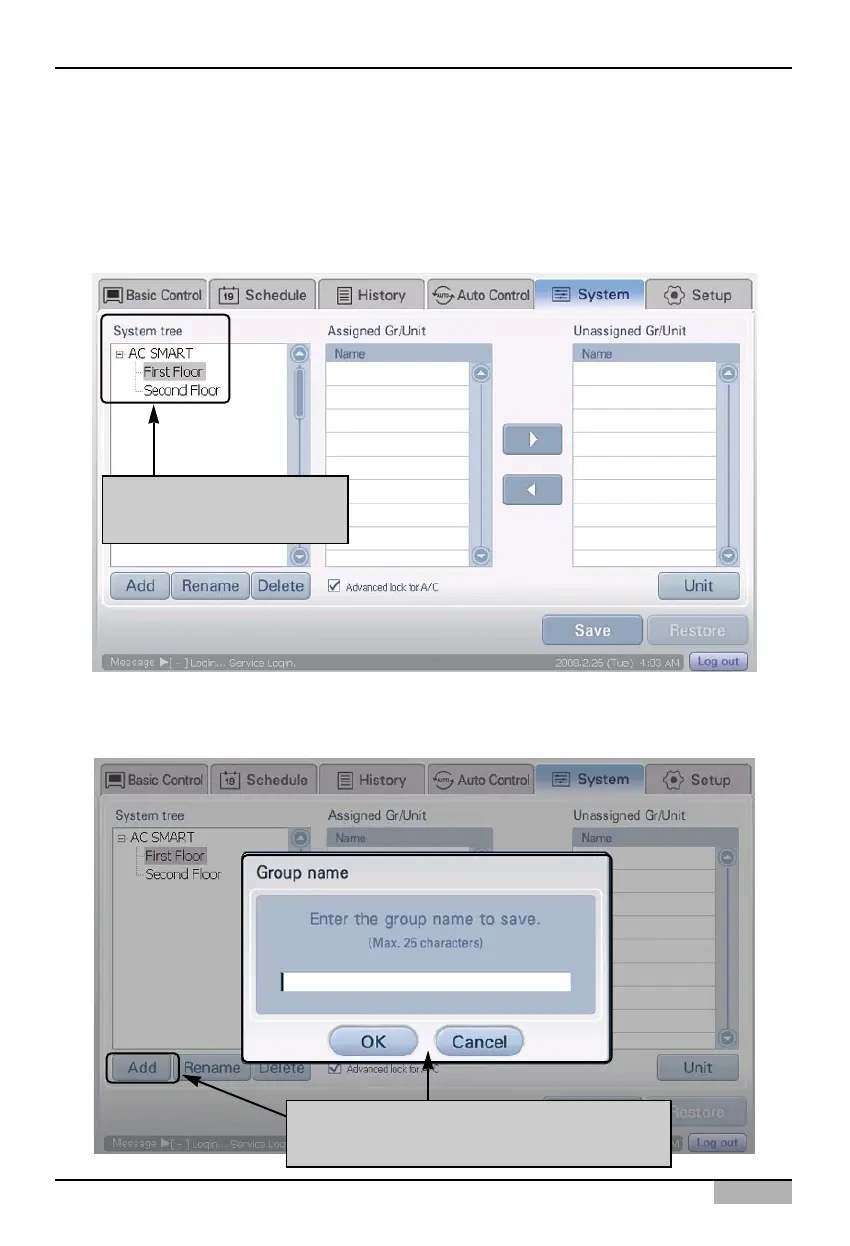 2. Click on [Add] button in system tree screen. 'Group name' screen to enter the name of the group to