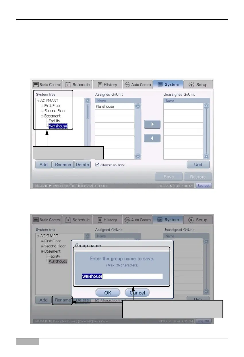 following screen is displayed. Select the group to rename from the 'System tree'.