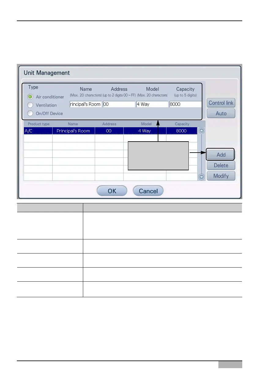 2. ‘Unit Management’ screen is displayed to register a unit. Enter the unit information and press [Add]