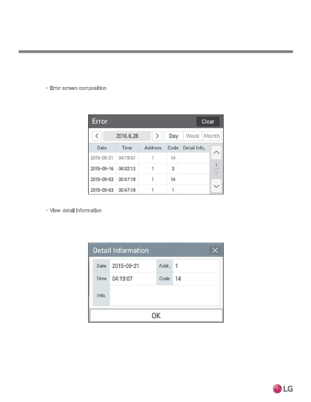 shows the error occurrence date, time, address, code, and the information of the error code.