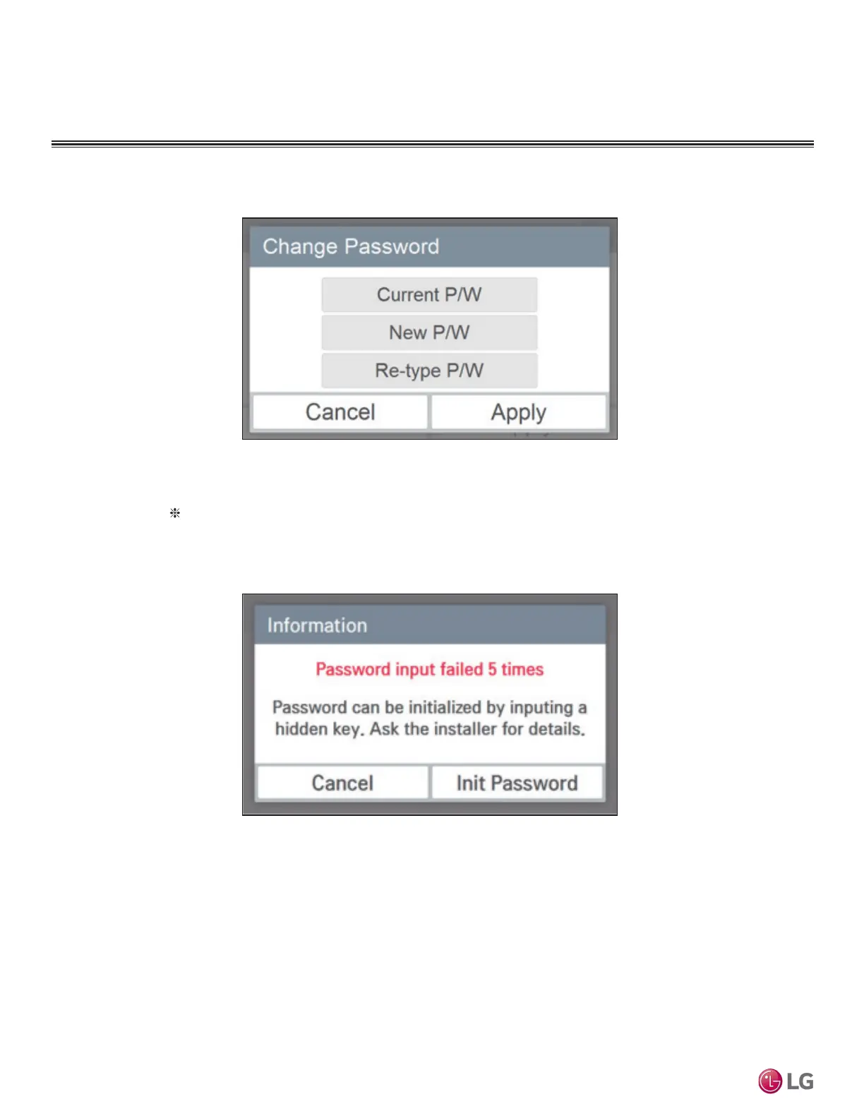 ② Input Current P/W, New P/W, and Re-type P/W, and press Apply button.
