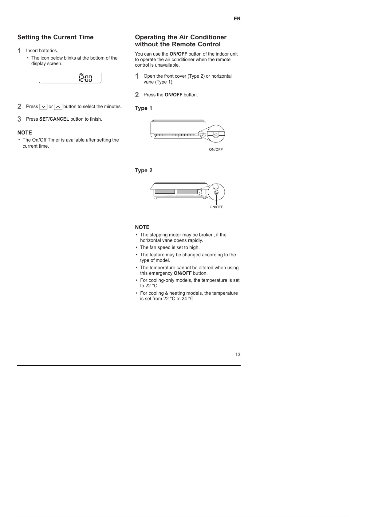 • The On/Off Timer is available after setting the