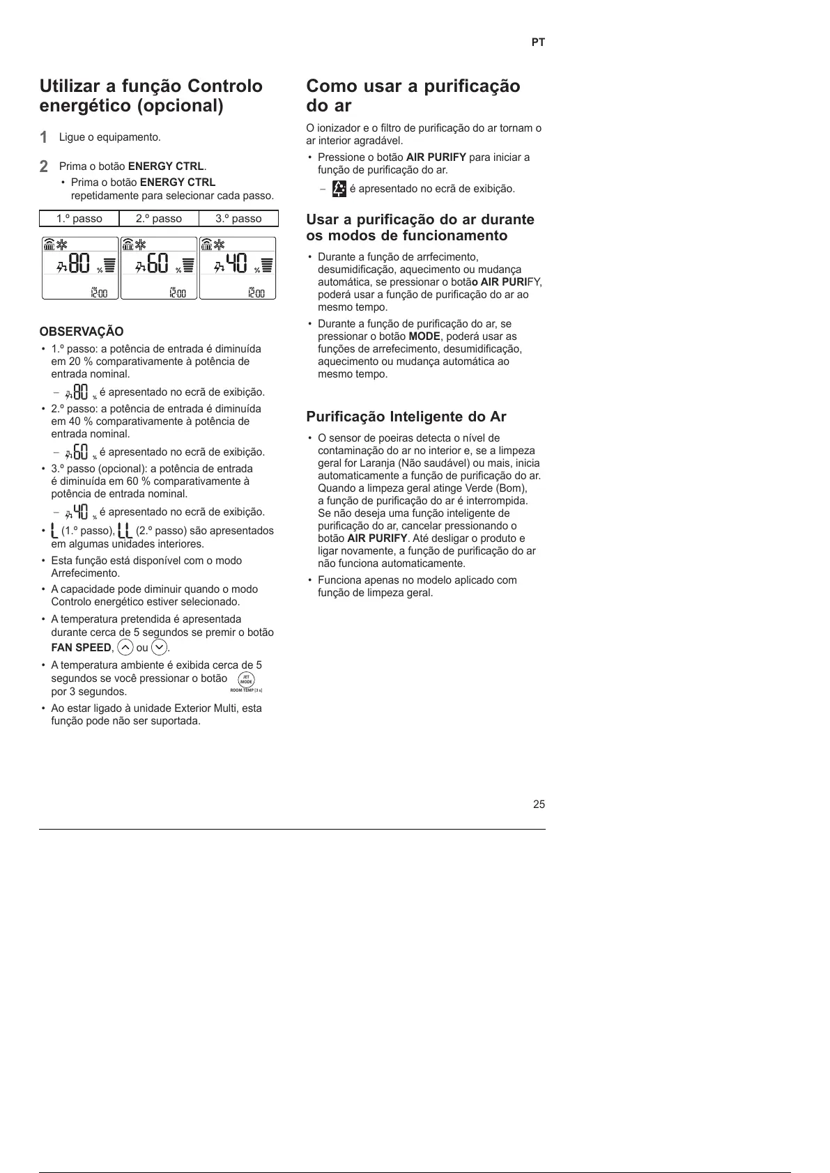 poderá usar a função de purificação do ar ao