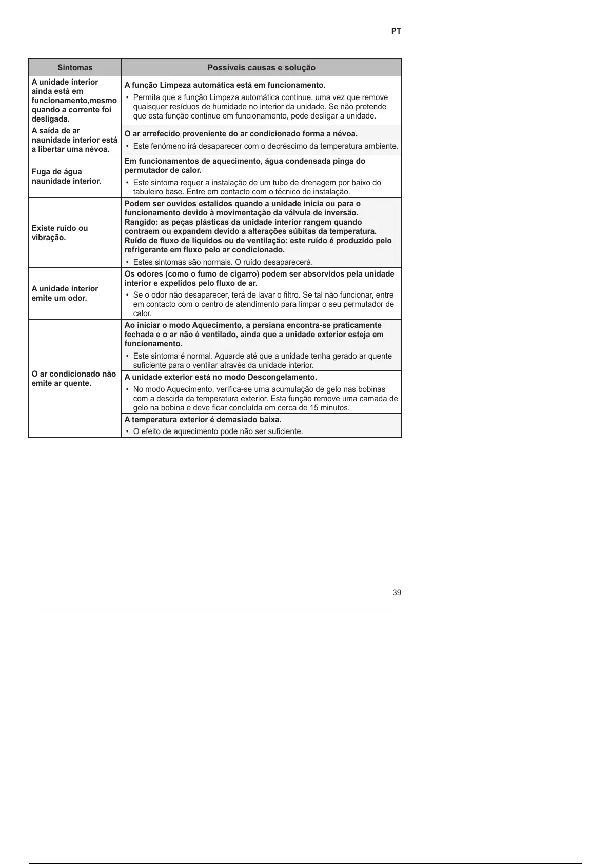 • Este sintoma é normal. Aguarde até que a unidade tenha gerado ar quente