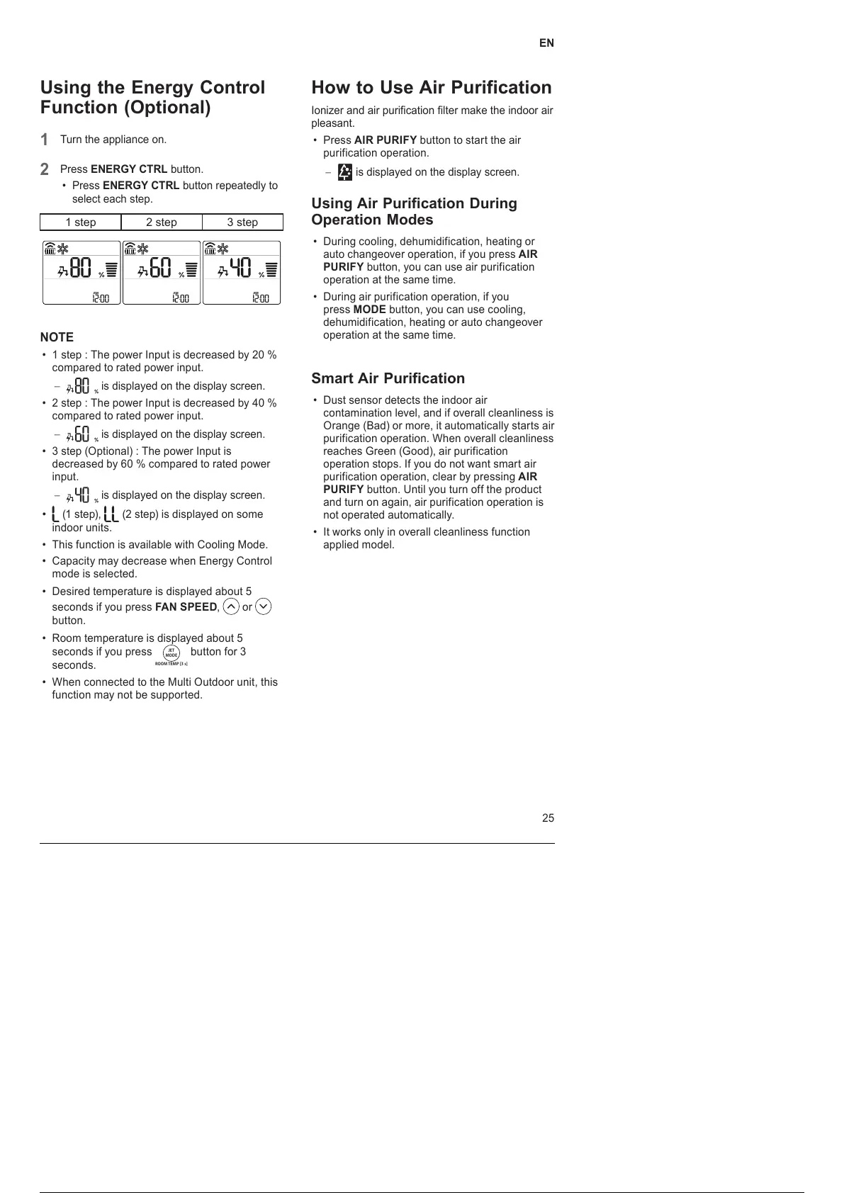 • Press ENERGY CTRL button repeatedly to