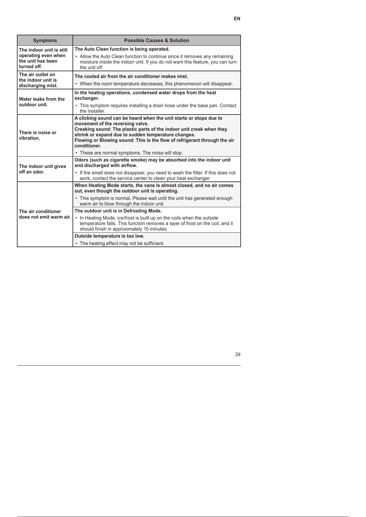 • In Heating Mode, ice/frost is built up on the coils when the outside