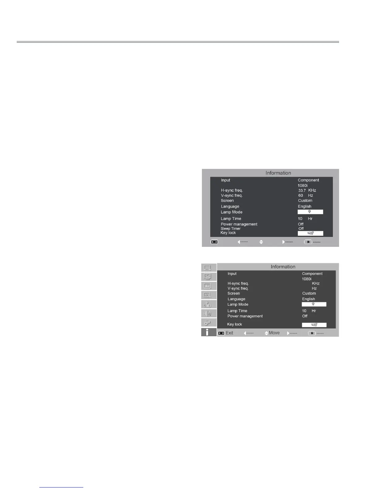 Press MENU button to display the screen menu. Press ▲▼ to select information icon, the information