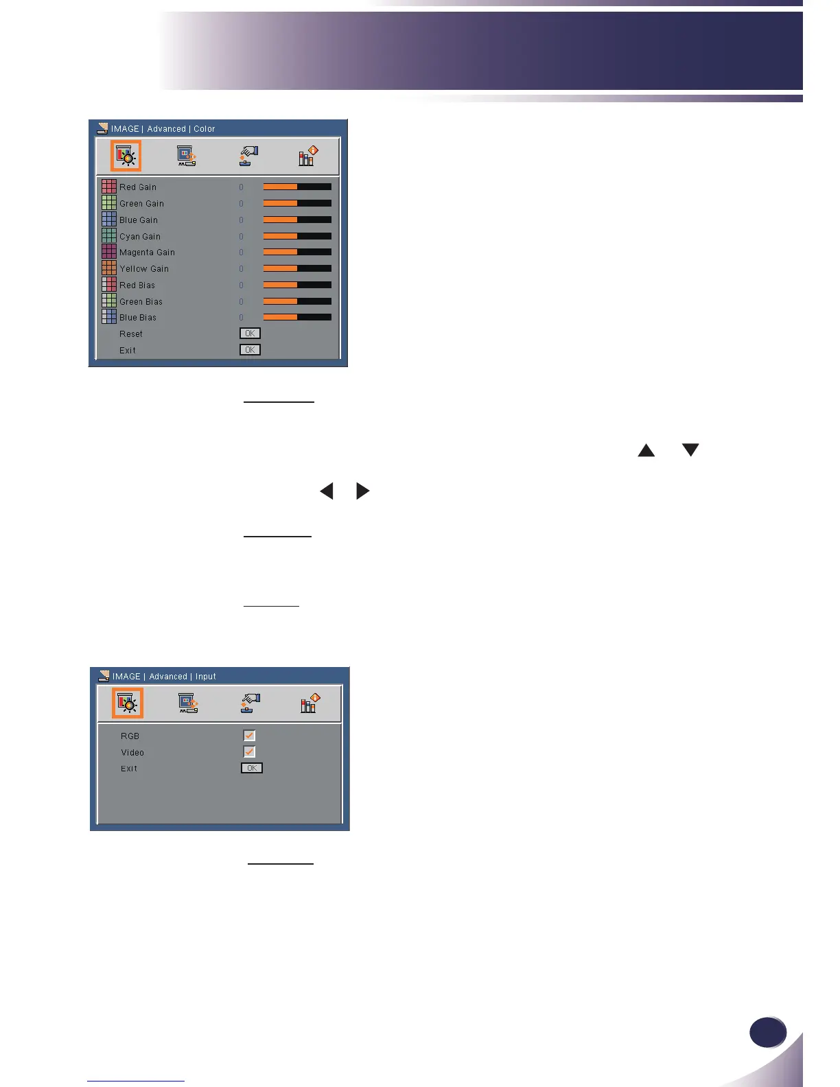 low Gain/Red Bias/Green Bias/Blue Bias: Use the