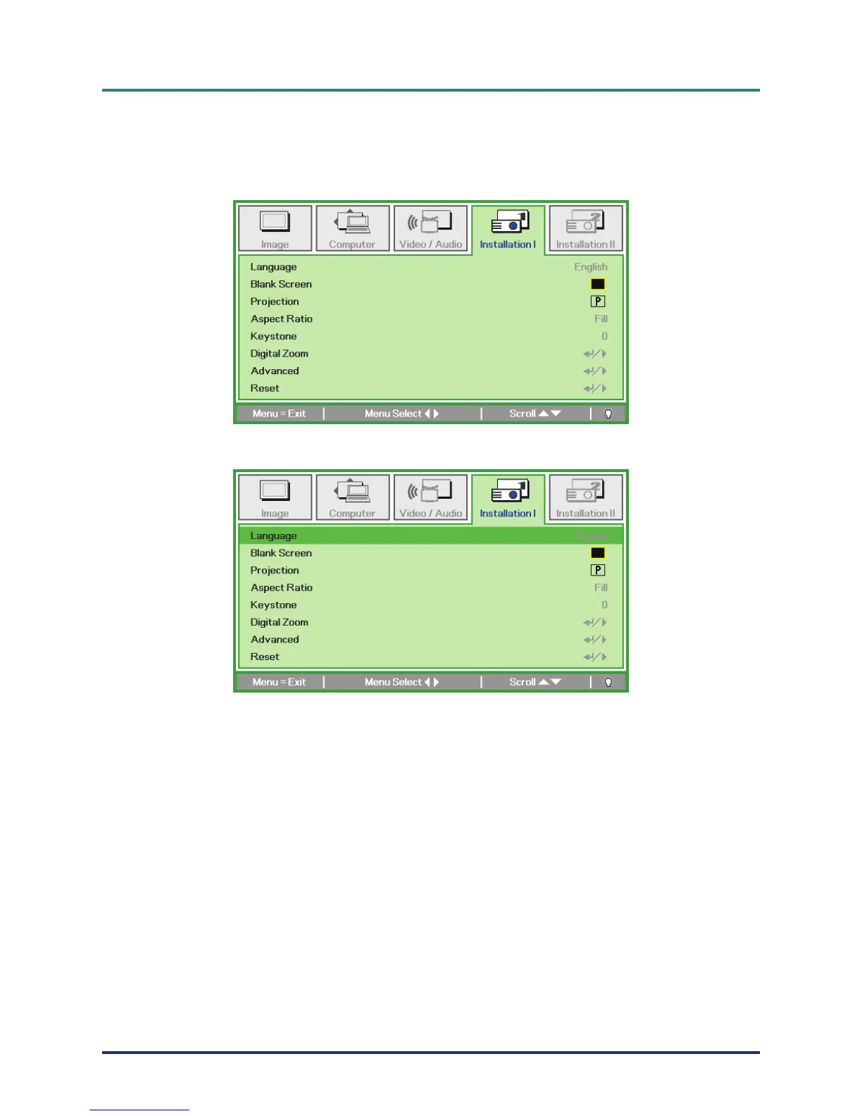 1. Press the MENU button. Press the cursor ◄► button to navigate to Installation I.