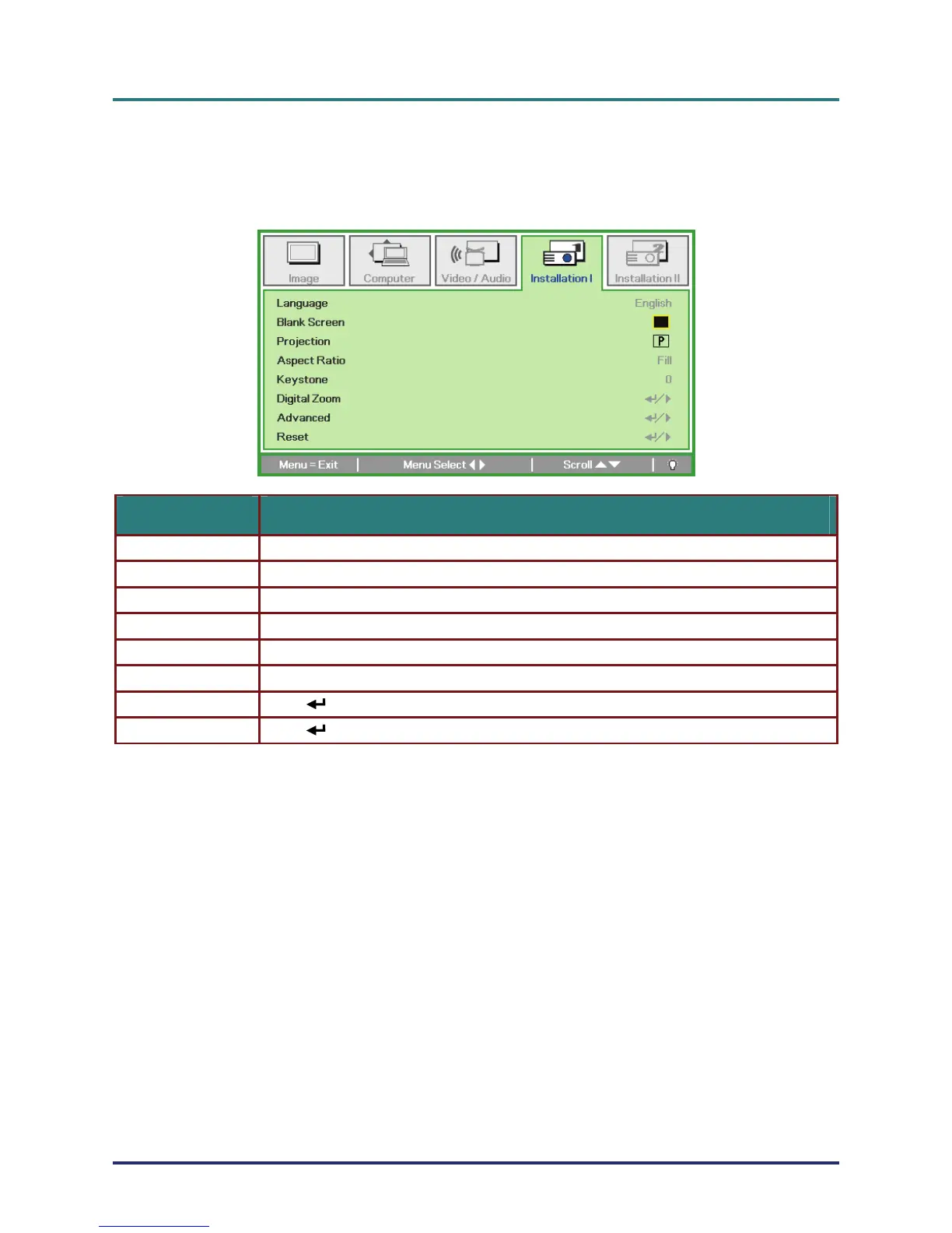 tion I menu. Press the cursor ▲▼ button to move up and down in the Installation I menu. Press